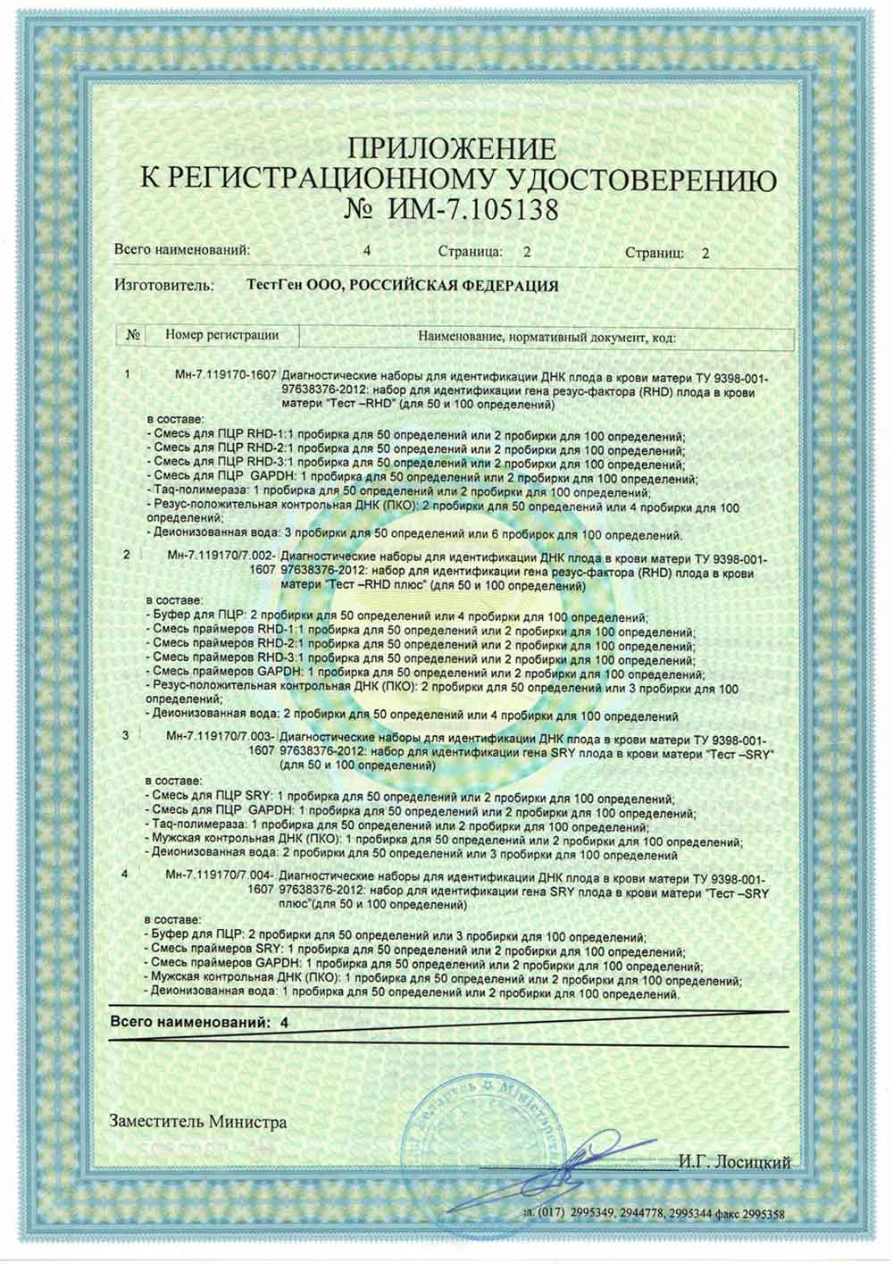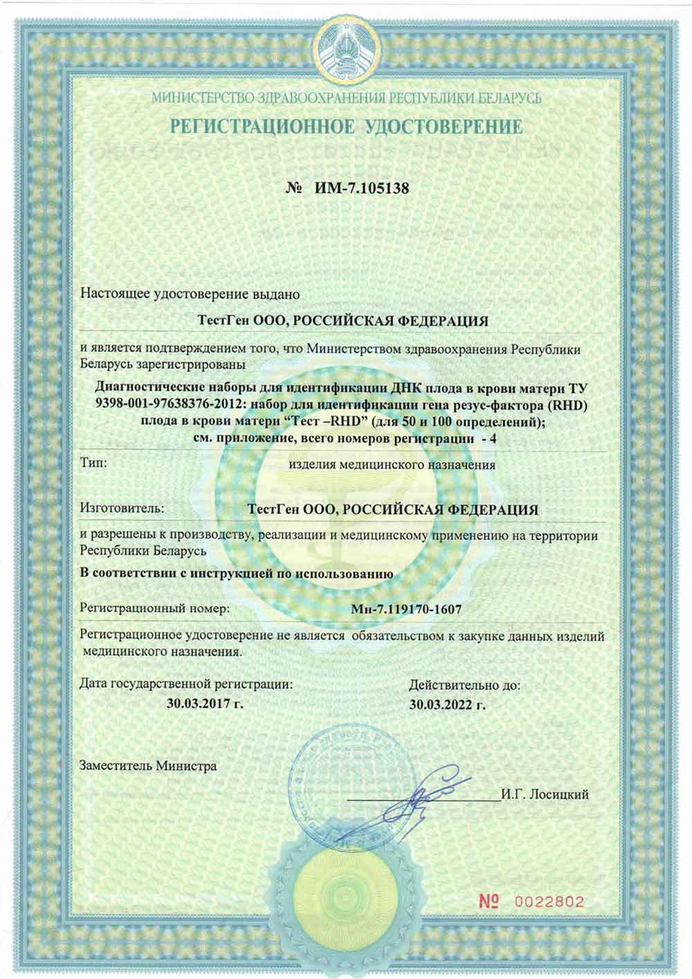 Компания "ТестГен" получила регистрационное удостоверение, выданное Министерством здравоохранения Республики Беларусь. Согласно этому документу наборы для идентификации гена резус-фактора (RHD) плода в крови матери "Тест-RHD" зарегистрированы и разрешены к применению в медицинской практике на территории Республики Беларусь.