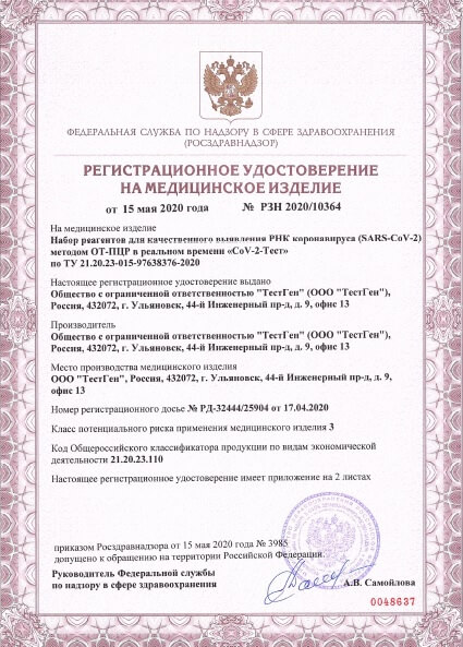 15 мая компания «ТестГен» получила регистрационное удостоверение на набор реагентов для качественного выявления РНК коронавируса (SARS-CoV-2) методом ОТ-ПЦР в реальном времени «CoV-2-Тест» и приступила к массовому производству.