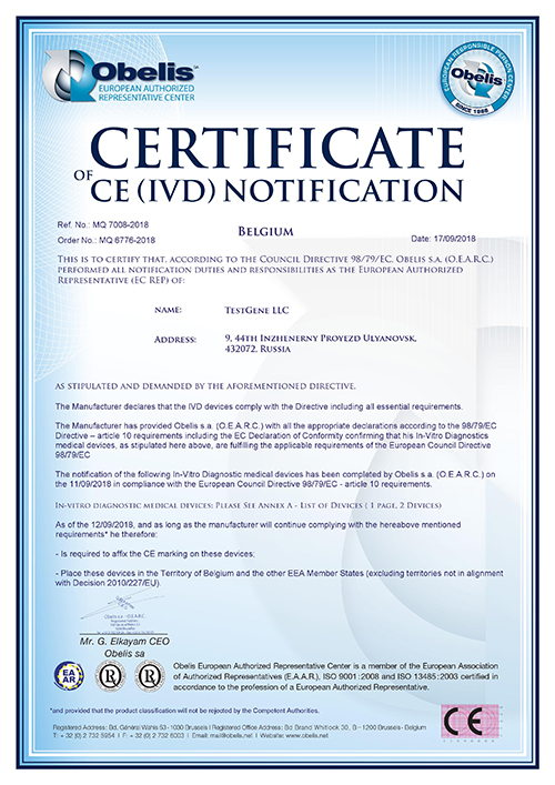 Компания получила регистрационное удостоверение в Белоруссии на набор реагентов "ДНК-Плазма-М"